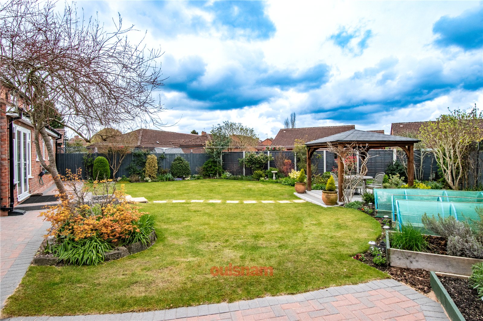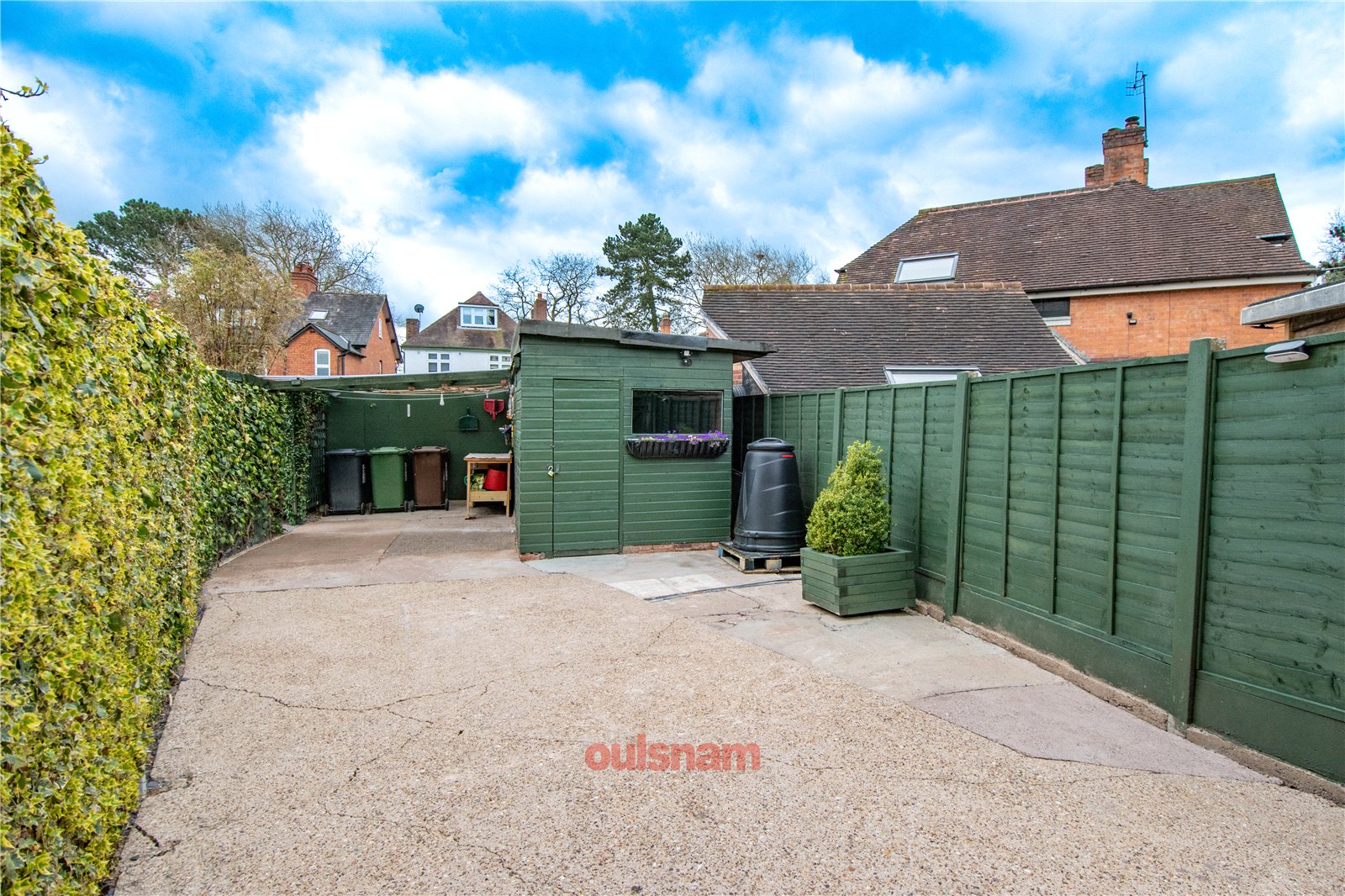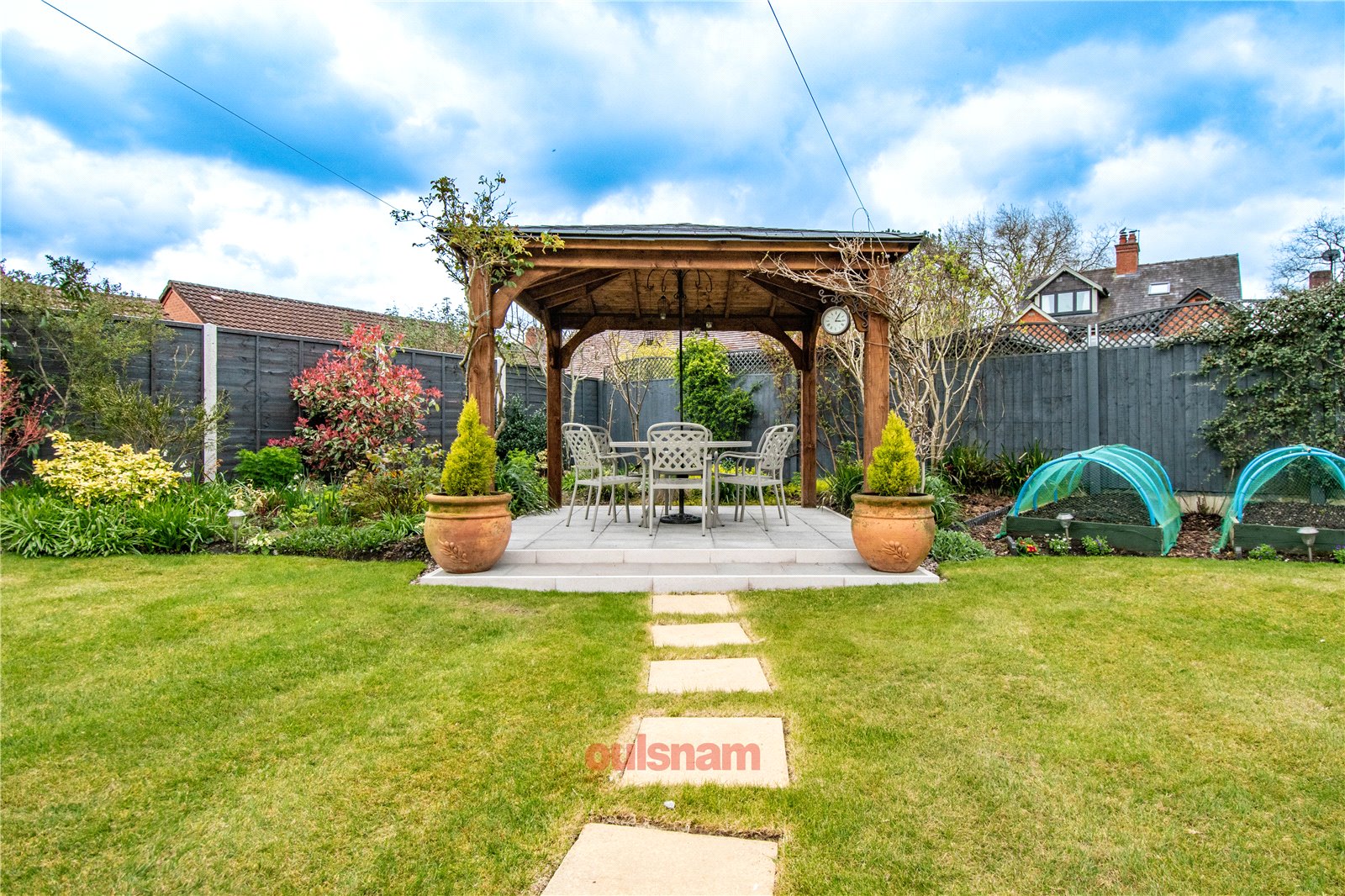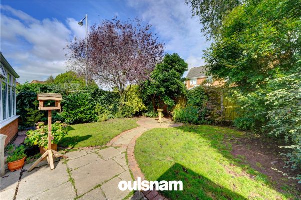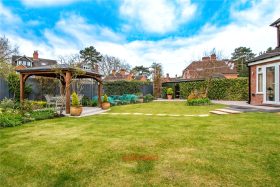 * Rear garden which has a patio area leading to a turfed lawn with steps through the centre leading to a paved seating area with a timber pagoda. To the right of the garden there is a driveway offering secure parking with a timber shed and covered area. The garden has a beautiful collection of mature plants, trees and shrubbery