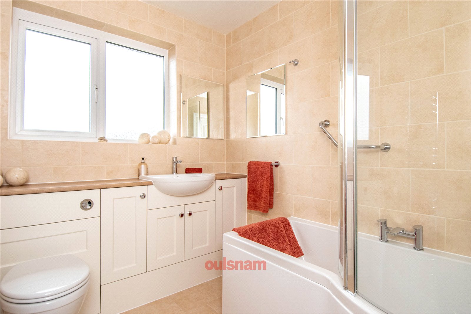 * Bathroom which has a bath with a shower over and a vanity unit with storage and an inset wash hand basin and low level toilet. There is a window looking out to the rear