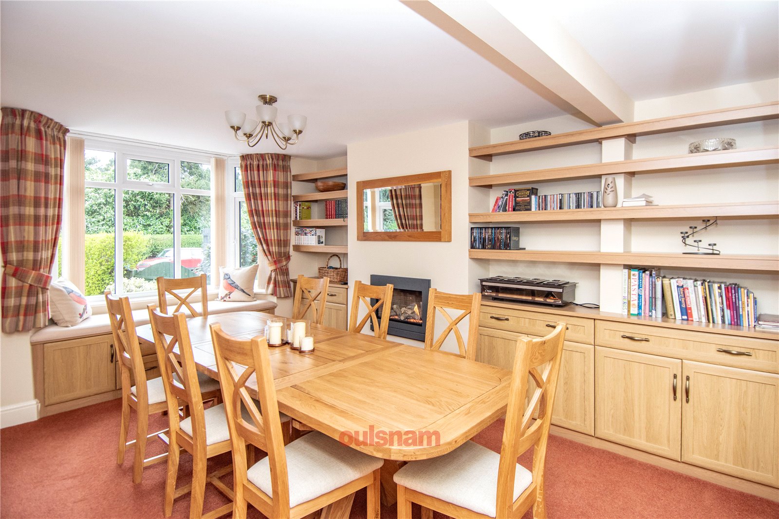 * Dining room which has a wall mounted gas fire, a bay window, with a window seat, looking out to the front and an array of fitted storage cupboards and shelving