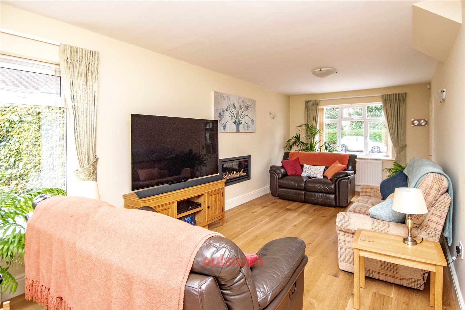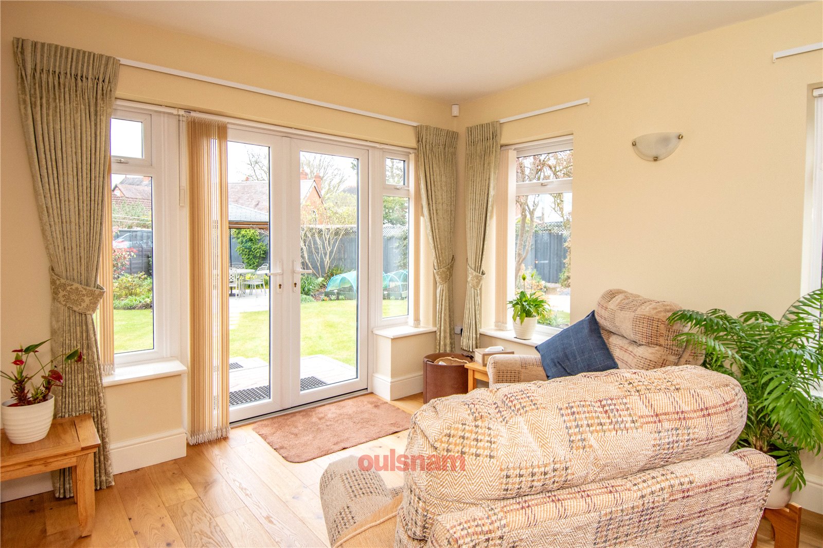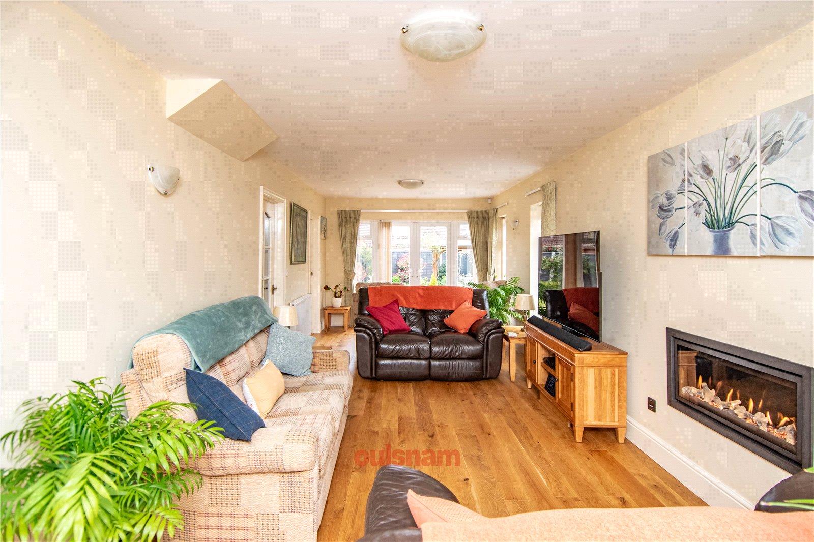 * Through lounge which has a wall mounted gas fire, windows looking out to the front, side and rear, French doors opening out to the rear garden and doors to the