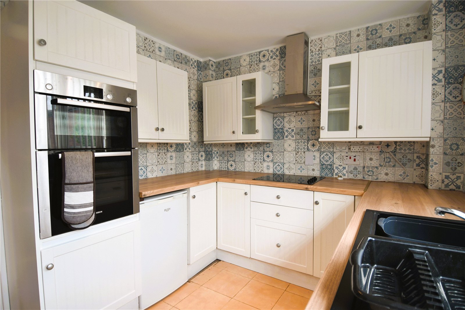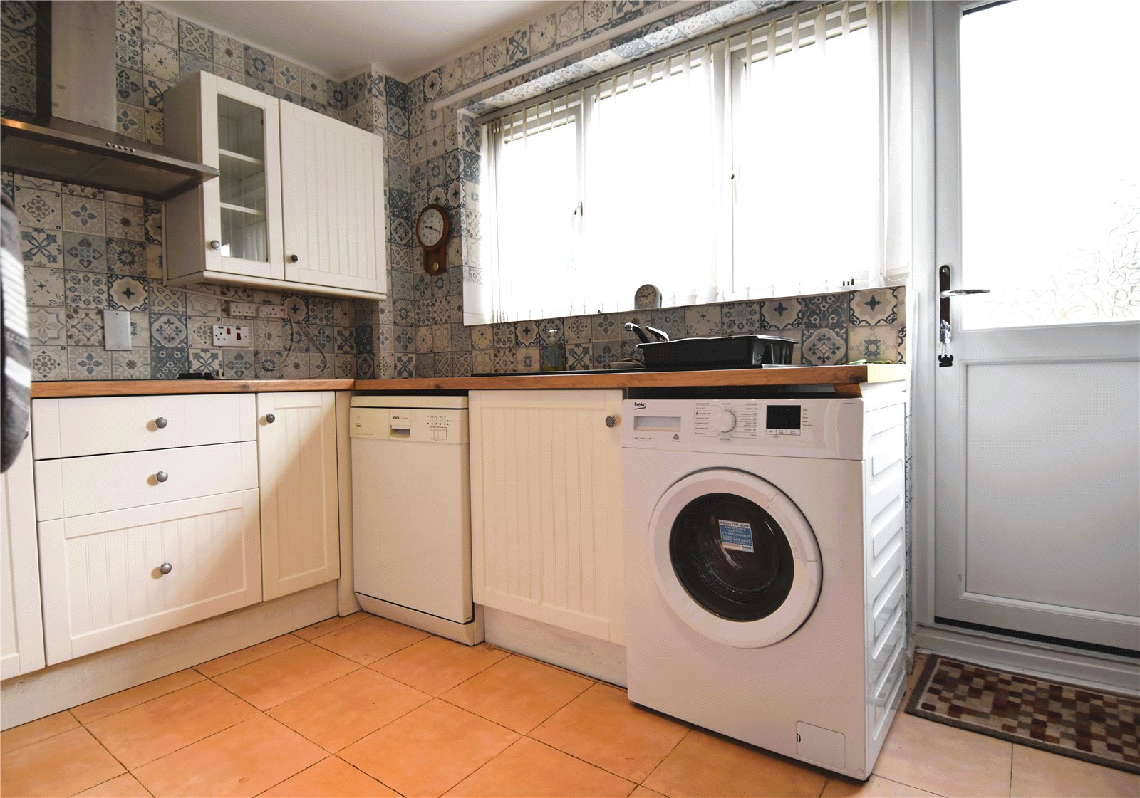 * Fitted kitchen with a modern range of wall mounted, drawer and base units, integral double oven, hob with extractor hood above, space for free standing appliances and door to the rear garden