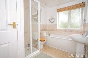 Bathroom which has a bath, an enclosed shower cubicle, a wash hand basin, a low level toilet, access to an airing cupboard and a window looking out to the rear.