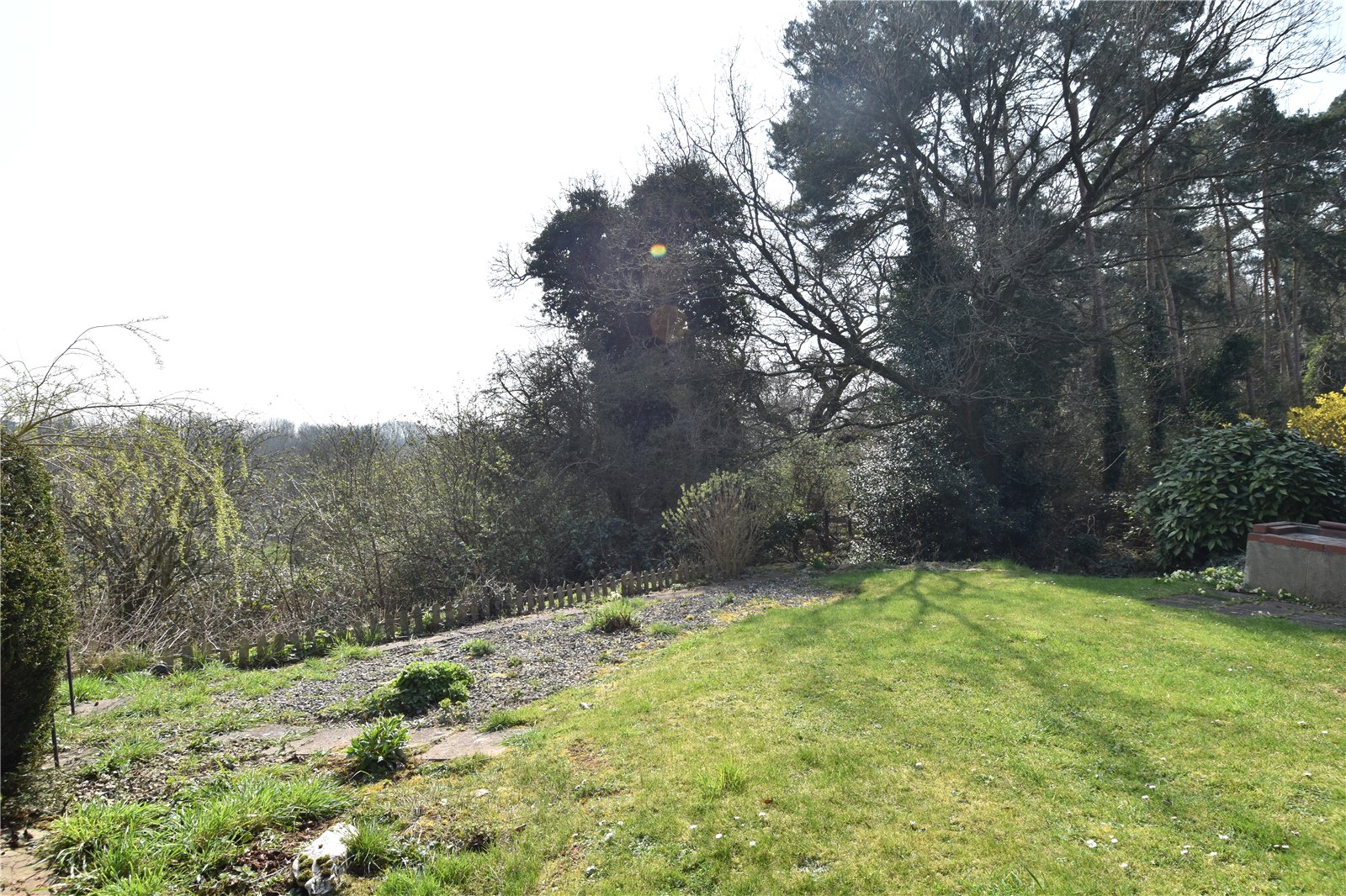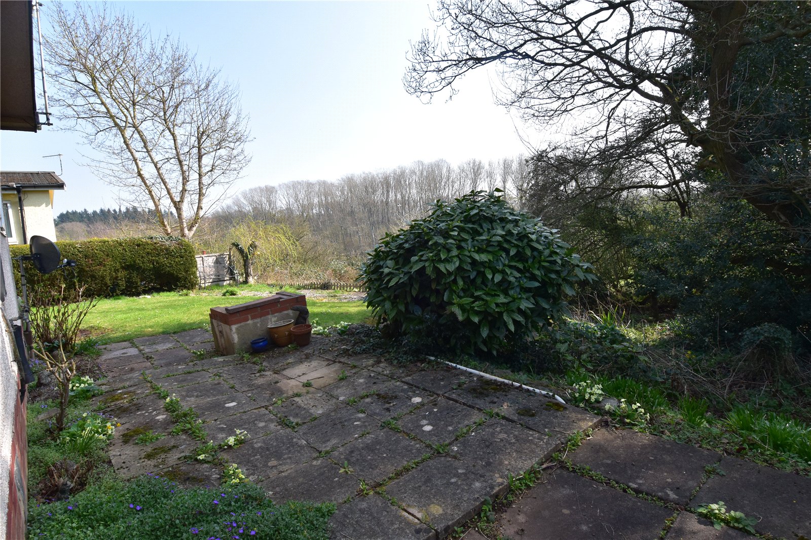 * Generous gardens surrounding the property featuring a paved patio area for table and chairs and a metal shed for storage, well-manicured lawn areas bordered by flowers, trees and shrubs.