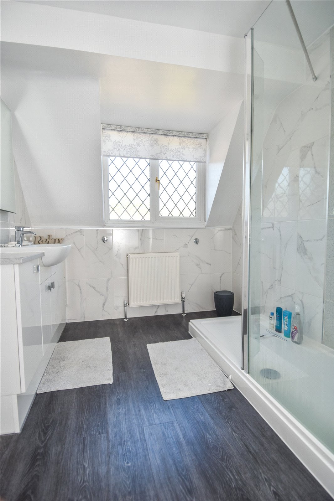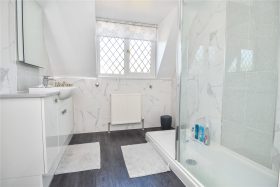 The stylish refitted shower room is fully tiled with a large walk-in shower with glass screen, wash hand basin with a range of vanity units below and low level w.c.