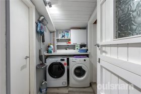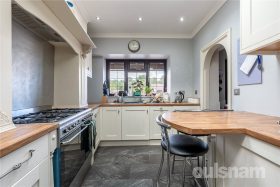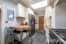 The breakfast kitchen is thoughtfully appointed with a breakfast bar, wood-effect worktops, and shaker-style cabinetry. Appliances include a 'Smeg' range-style cooker, American fridge-freezer, integrated dishwasher, one-and-a-half bowl sink with filtered tap, plus skylights and a front-facing window that flood the room with natural light. A door leads into the utility room, offering space & plumbing for washing machine and dryer. An doble glazed door leads out to the rear garden.
