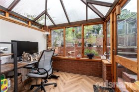 The property enjoys a generous, well maintained tiered rear garden to include a lawned area, leading to a decked terrace, ideal for outdoor dining, while a pond with Carp, adds a touch or serenity. Outdoor enthusiasts will appreciate the brick-built BBQ, two useful garden sheds, and a greenhouse, all included with the property. The garden is further enhanced by established fruit trees—apple, cherry, and plum—along with an abundance of blackberries, creating a delightful haven for those who enjoy homegrown produce.