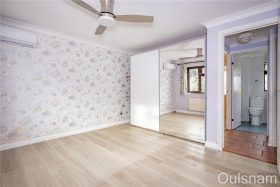 Bedroom one which has air conditioning, a freestanding wardrobe and a window looking out to the rear.