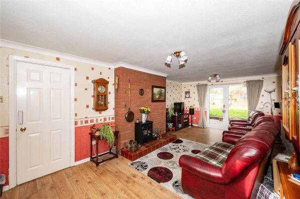 Generous dual aspect living room with patio doors leading into the conservatory which has French doors onto the rear garden
