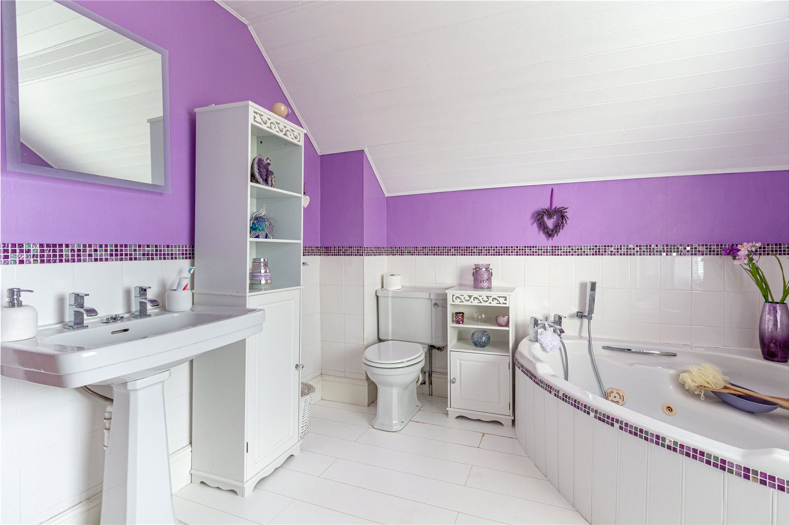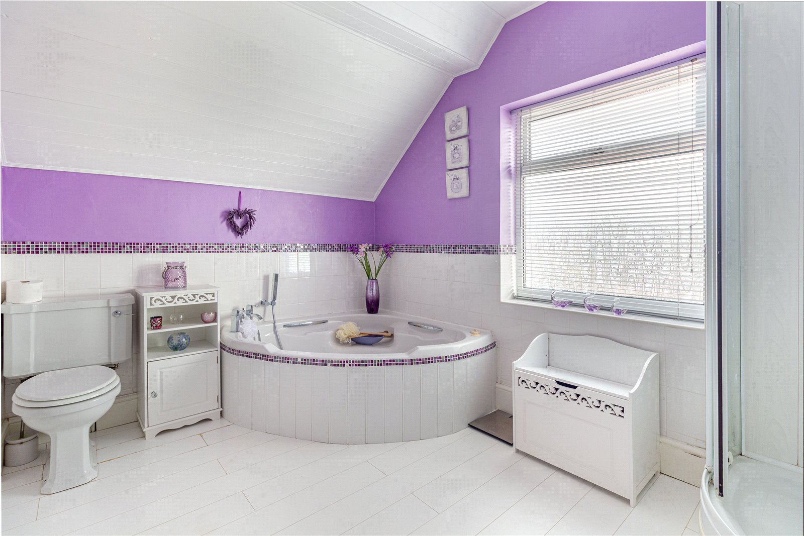 * The bathroom offers a contemporary four piece white suite comprising of shower cubicle, corner spa bath, low level flush W.C and pedestal hand wash basin. There is a heated towel rail, obscure window to the rear and access to the loft space.