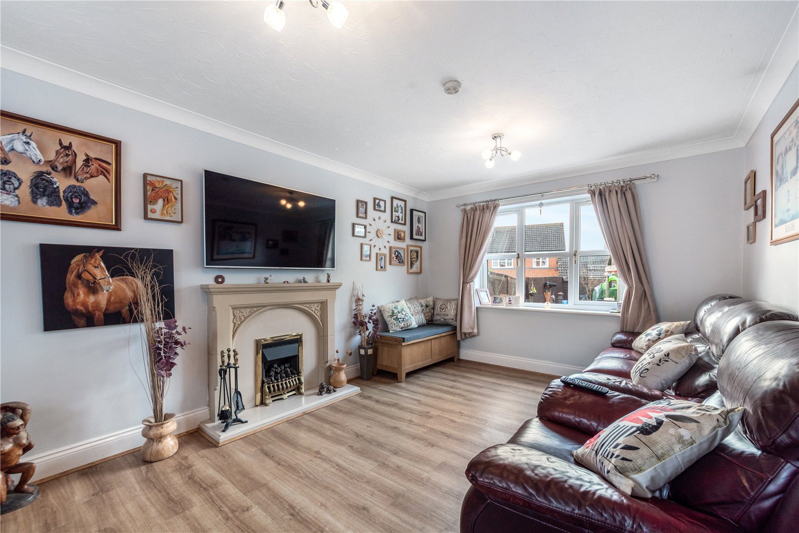 The dual-aspect living room is a bright and elegant space, featuring a bay window to the front and an attractive fireplace, creating a warm focal point.