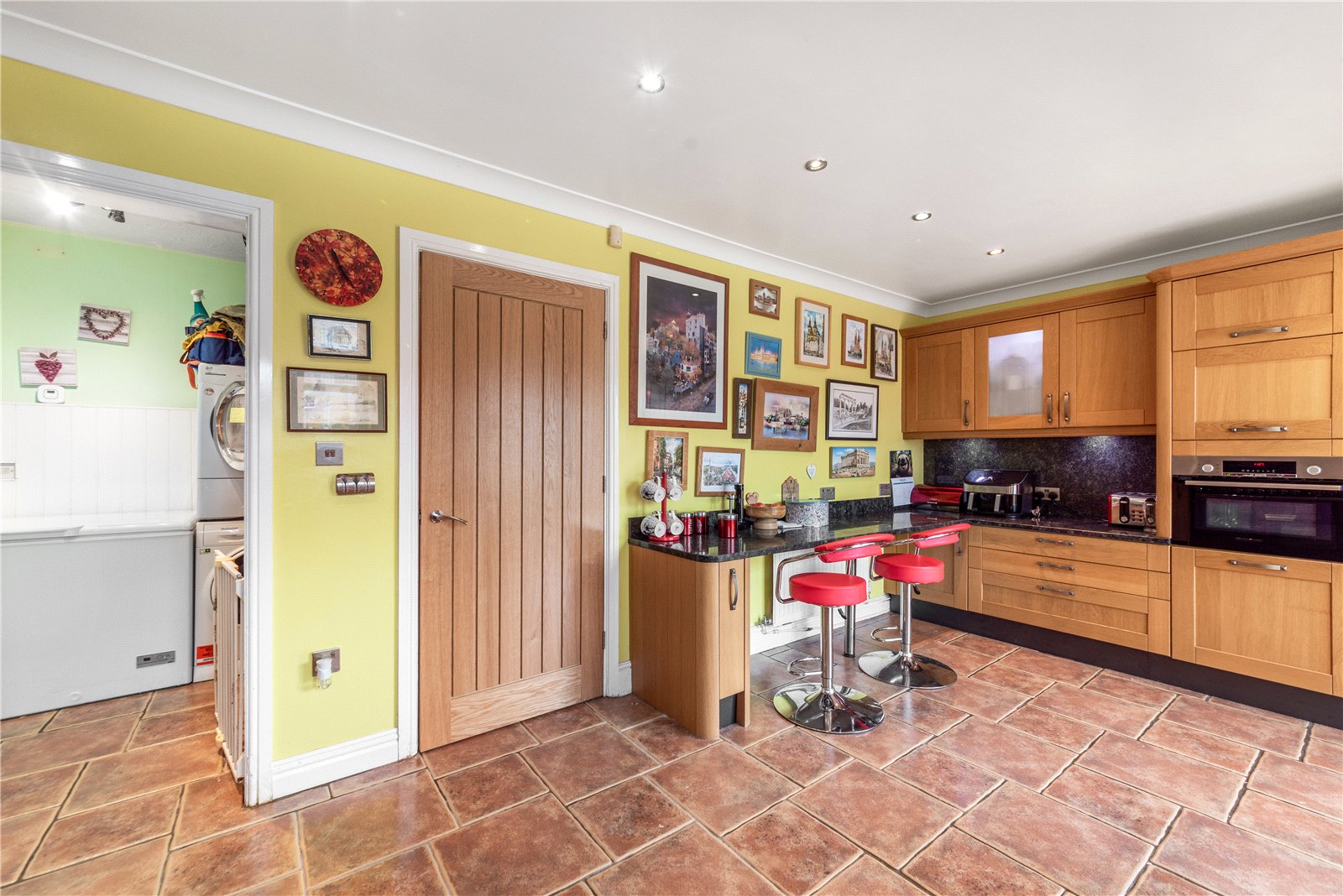 A separate utility room provides additional practicality, offering space for a washing machine, tumble dryer and chest freezer, and houses the boiler.