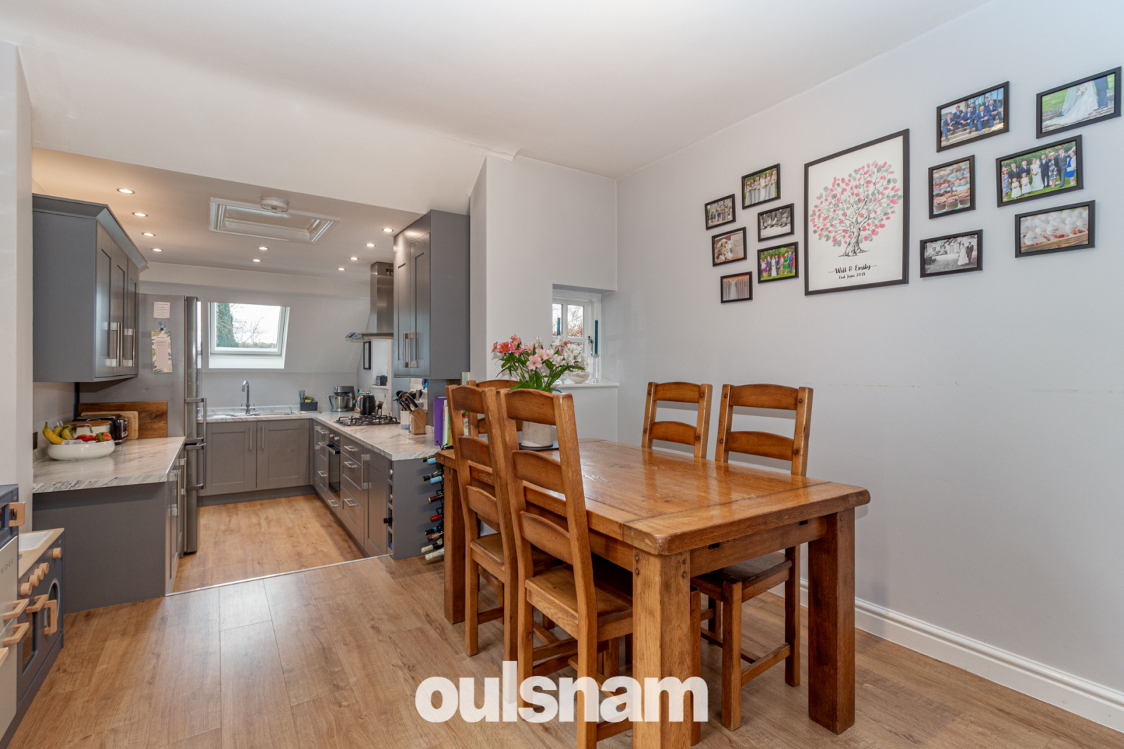 *Extended kitchen-diner with pitch roof comprising of dining area with steps leading down to the kitchen with comprises of a range of grey wall and base units’ cupboards and doors gas hob with oven and extraction canopy above one and half bowl stainless steel sink unit plumbing for dishwasher dual aspect windows to include Velux window to the roof
