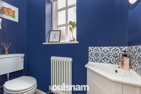 *Hallway with space for the coats wall mounted box containing meters downstairs WC with decorative tiling to the floor and circular window to stairs