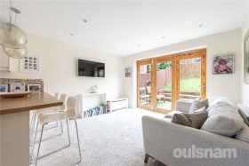 The living area benefits from bi-fold doors opening onto a rear patio, creating an ideal space for indoor-outdoor living and entertaining.