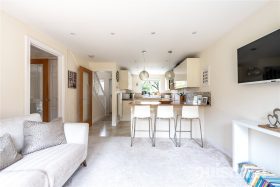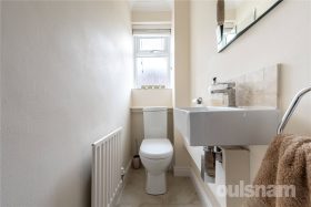 From the living area, a door leads to an inner hallway, which gives access to a guest cloakroom fitted with a floating sink, low-level WC, and tiled flooring. There is also a useful storage cupboard and a further door leading to a separate sitting room, which features bi-fold doors opening out to the rear garden.