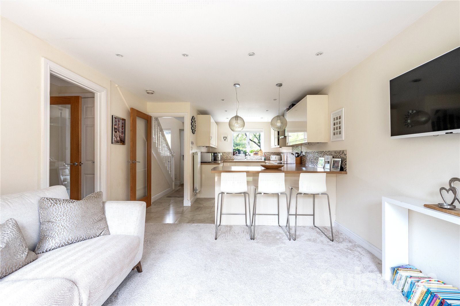 The front door opens into a welcoming hallway, featuring a staircase rising to the first floor and a door leading into a spacious open-plan kitchen/living area. The kitchen is well-appointed with a window overlooking the front aspect, a Belfast sink with mixer tap, high-gloss units, tiled flooring, and wooden work surfaces. There is a double oven, electric hob with canopy hood above, and a range of integrated appliances including a washing machine, fridge, and freezer. A stylish breakfast bar provides additional workspace and casual dining.