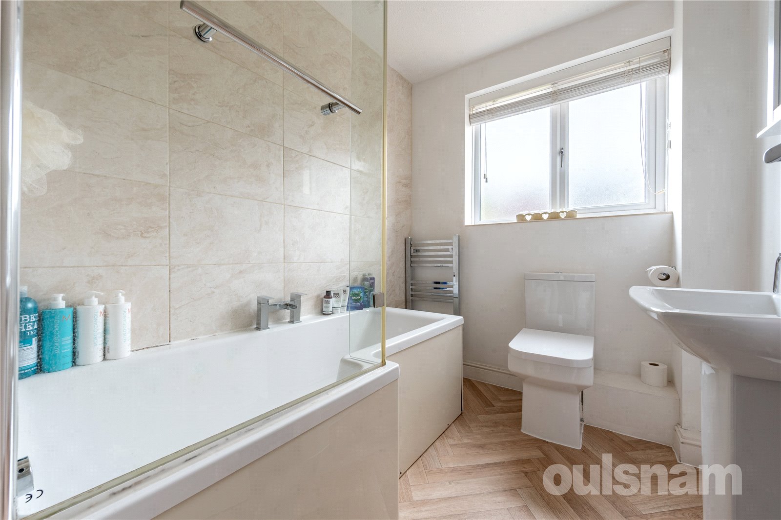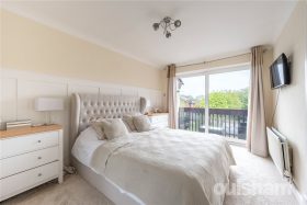 The first floor offers well-proportioned accommodation, comprising three bedrooms. Bedroom one is a standout feature, benefiting from oversized sliding patio doors that open onto an attractive balcony, along with a dedicated dressing area and a window overlooking the rear garden.