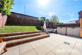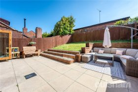 Externally, the rear garden features a patio area ideal for outdoor dining and entertaining, alongside a neatly lawned section.