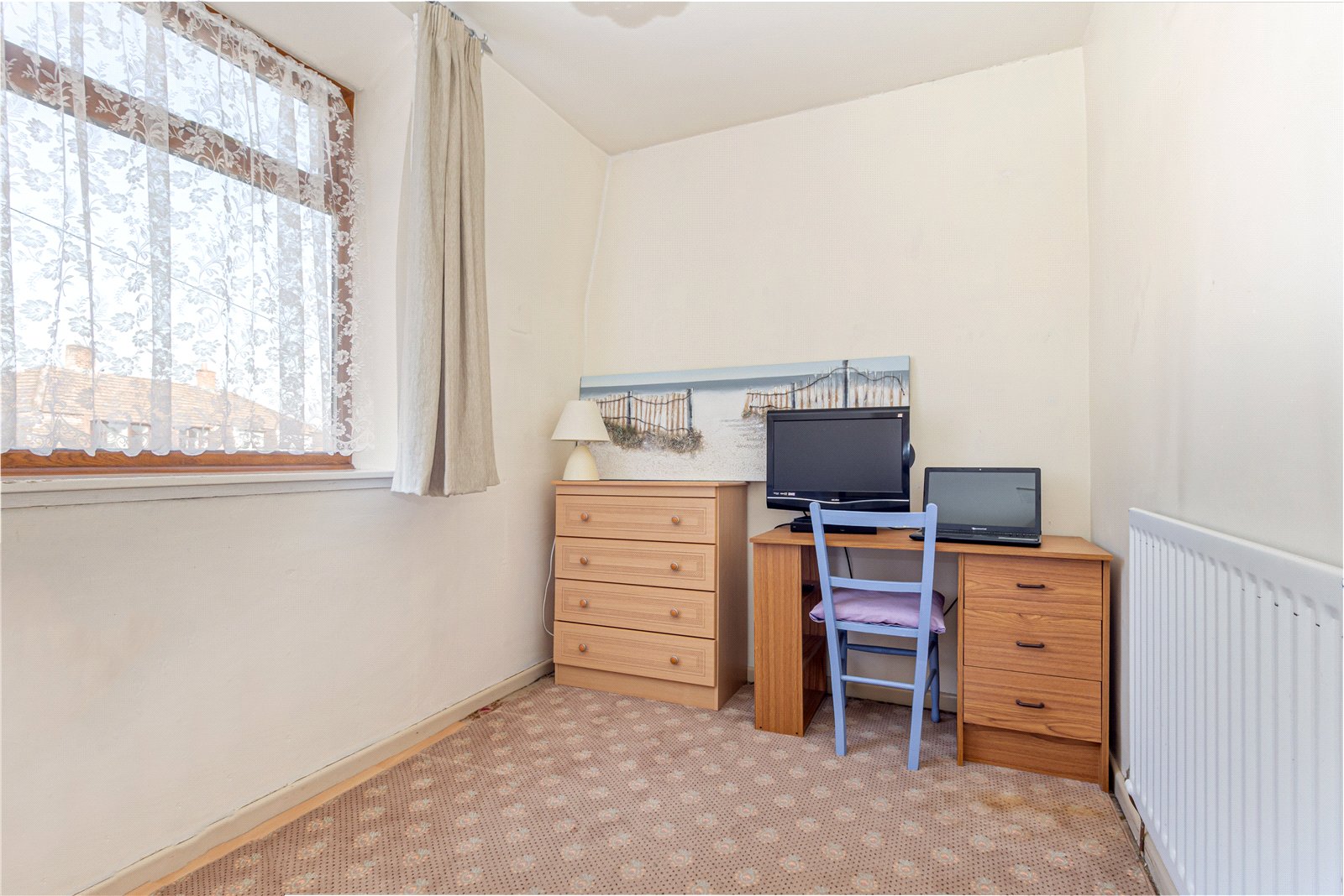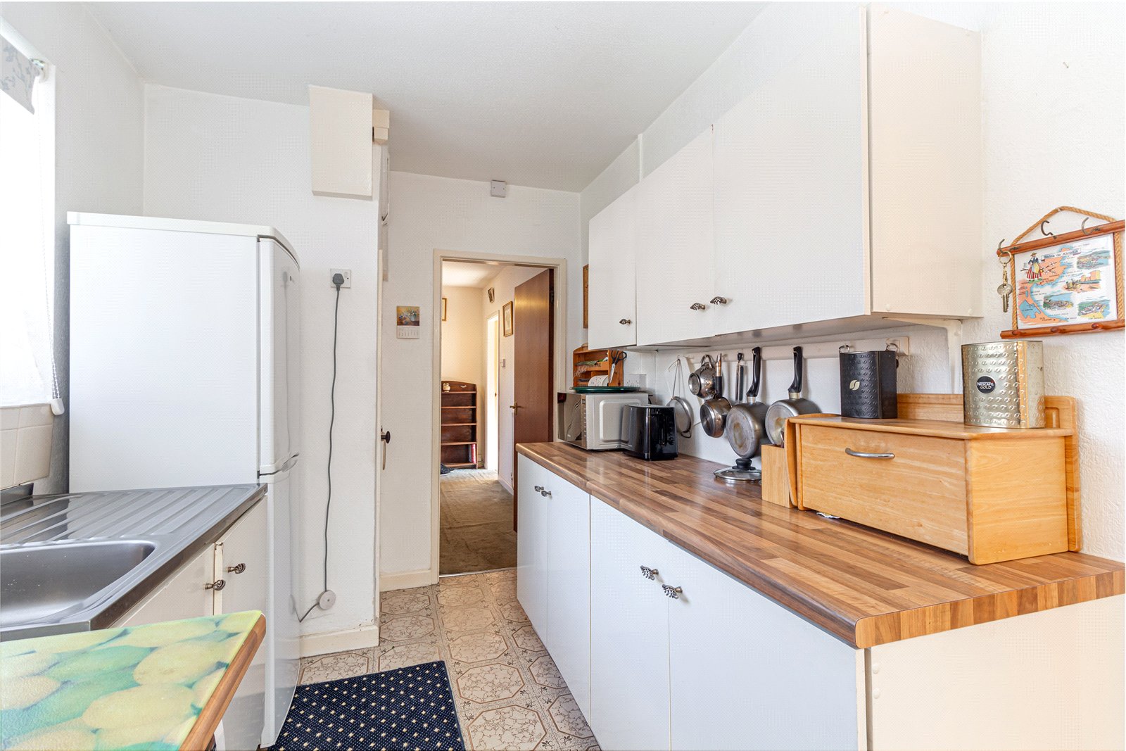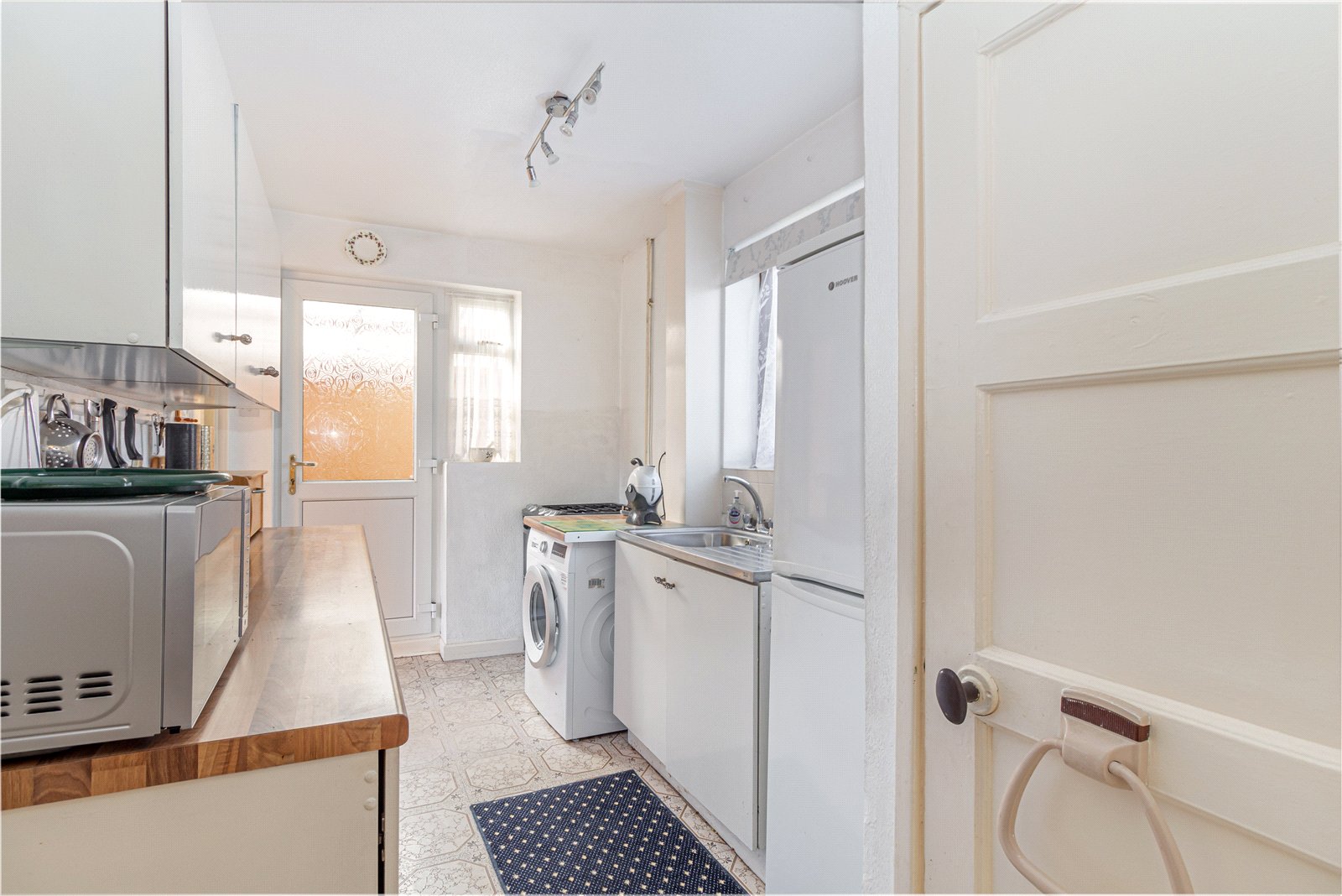 * The kitchen is fitted with a range of base and wall mounted units, stainless steel sink with drainer and a window which overlooks the front garden. There is space for a freestanding gas oven, fridge-freezer and washing machine. There is a storage cupboard, housing the gas boiler;
