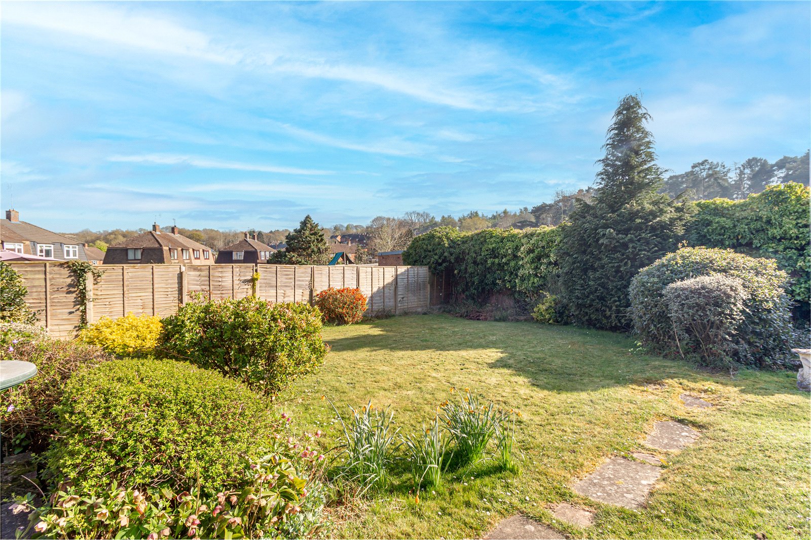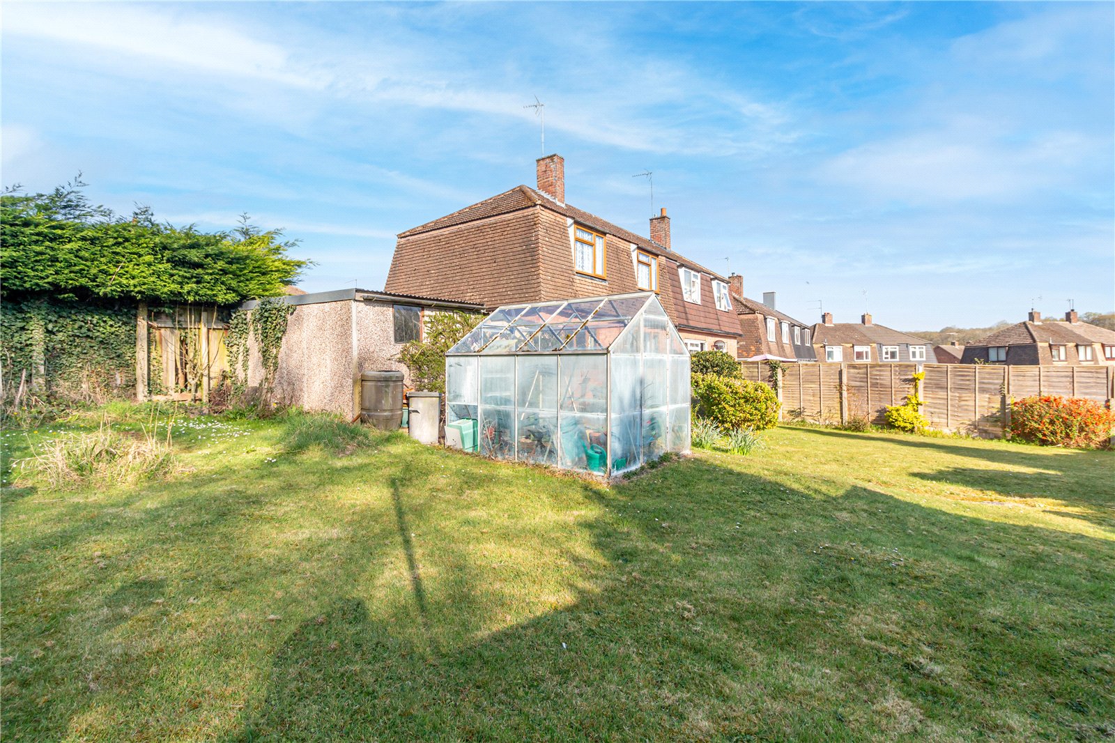 The generous rear garden has an initial patio area and the rest is mainly laid to lawn, within fenced boundaries. There are mature shrubs, trees and a greenhouse. To the side is a generous area which offers further parking or potential to extend STPP.