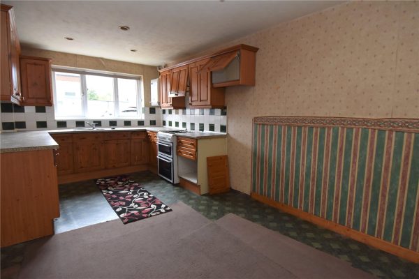Kitchen which has a mixture of wall mounted and base units with worktops over with an inset stainless steel sink drainer. There is an integral electric oven and gas hob. There is a window looking out to the front and doors to the side-passageway, hallway and an opening back into the dining room.