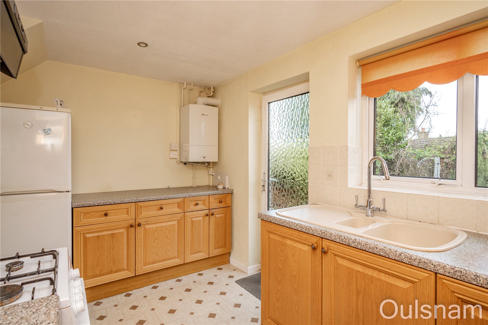 Kitchen which has a mixture of wall mounted and base units with worktops over with an inset composite sink drainer. There is a freestanding gas cooker and hob and an integral extractor hood above. There are connections for a fridge/freezer and a washing machine. There is a window looking out to the rear and a door out to the rear garden.
