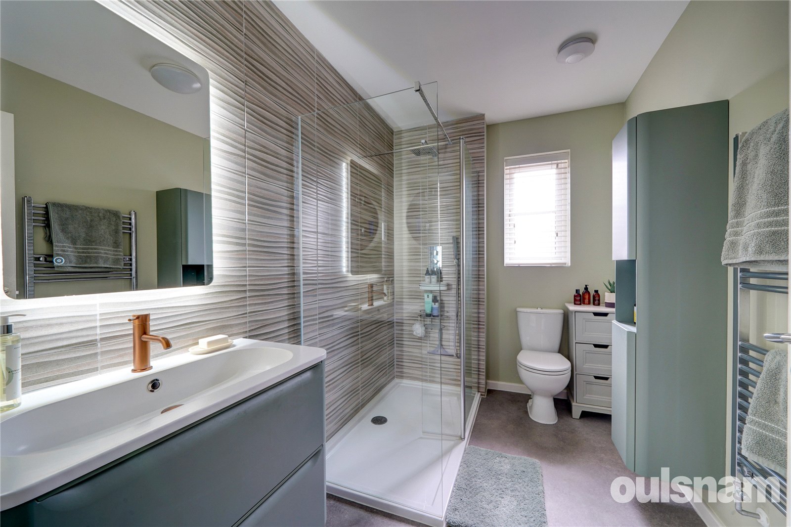 * Contemporary family shower room is fitted with a white suite comprising walk in shower, wash hand basin set into vanity/storage unit and dual flush wc