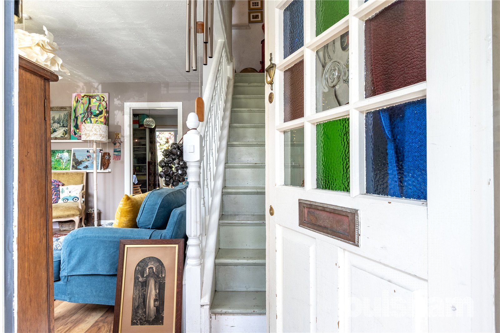 * Lounge with coal effect gas fire with wooden surround, bespoke fitted storage to chimney recess along with shelving, understairs storage cupboard and doors to the first floor