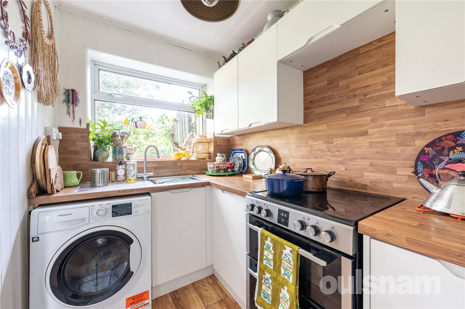 * Modern kitchen (installed 2022) with contemporary units, single bowl stainless steel sink unit and mixer tap, integrated fridge and freezer, space for cooker and plumbing for washing machine