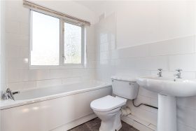 • White bathroom suite with low-level WC and pedestal wash basin.
