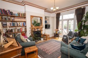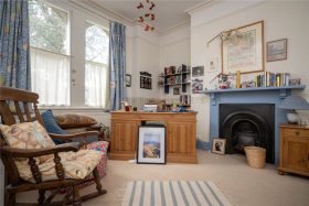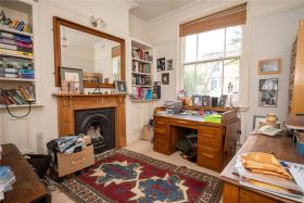 The front reception room has a stripped wooden floor, feature fireplace and mantel with tiled inset and hearth, cornicing & picture rails and bespoke storage cabinets with display shelving over.