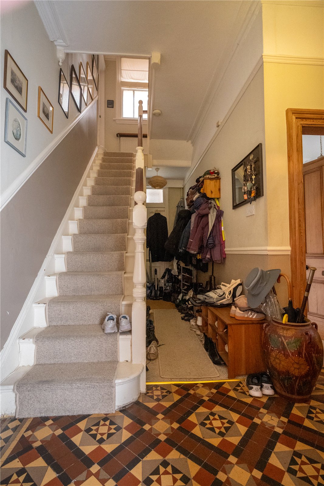 The L-shaped reception hall has an original Minton tiled floor, original ceiling cornicing & picture rails, stairs to the first floor with spindle balustrade, access to a walk-in cloakroom room with doors to the side entry and cellar and panelled doors lead in turn to the ground floor accommodation.