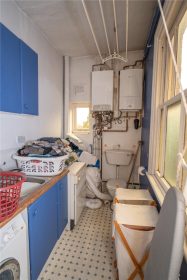 The cellar provides additional storage and the split level first floor landing leads to the laundry with fitted storage, spaces for washing machine & tumble dryer, two wall mounted gas central heating boilers and low level w.c.