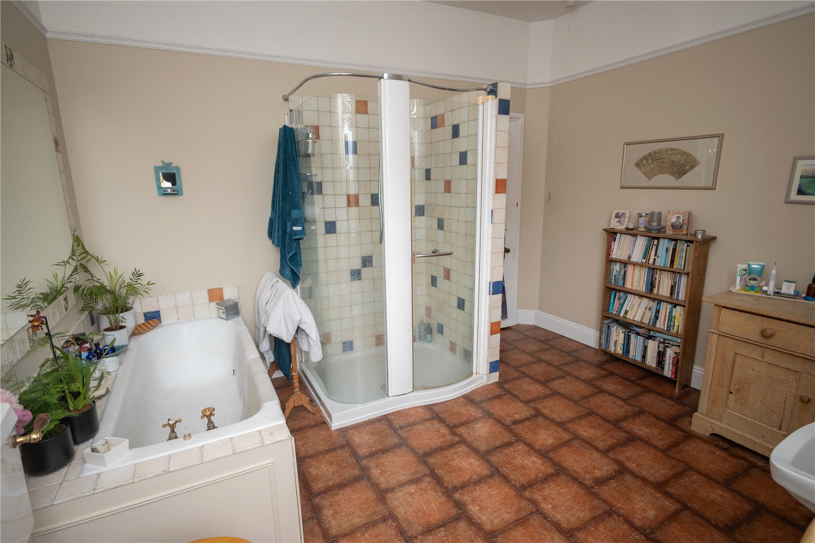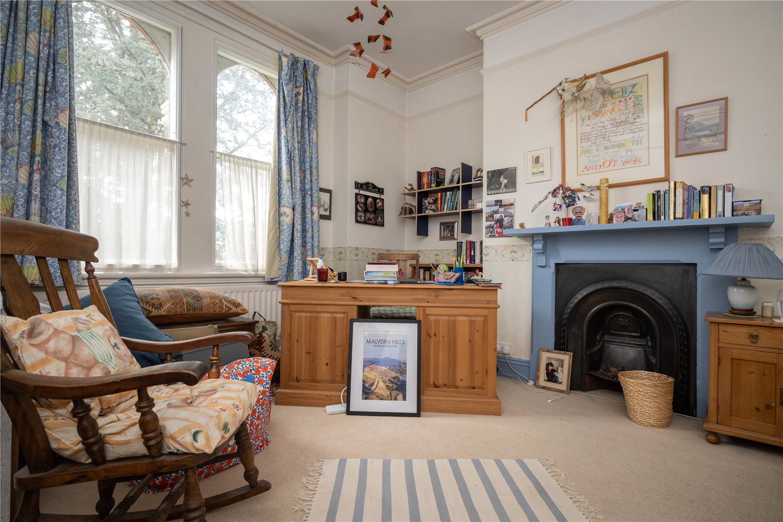The spacious cloakroom has a white suite, stripped wooden floor, dado rails and picture rails and the study has a feature pine fireplace & mantel with cast iron inset, ceiling cornicing & picture rails and two double storage cabinets with display shelving over.