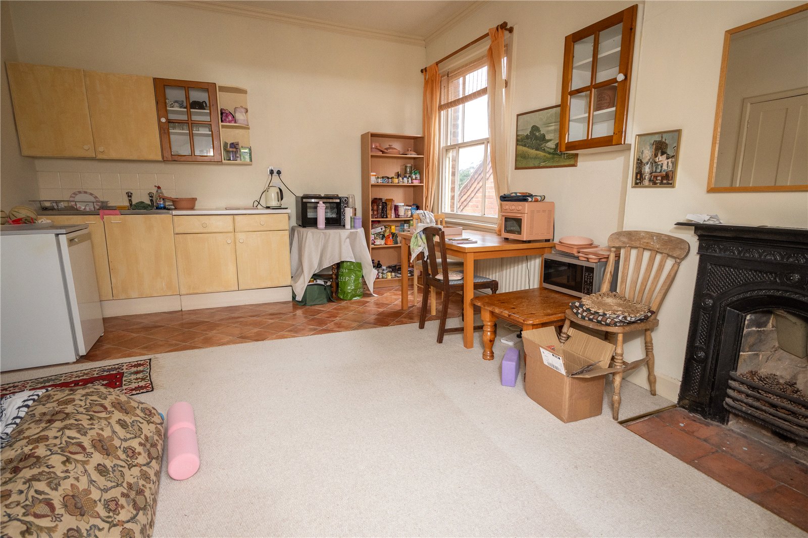 The kitchen is fitted with a range of panelled base and drawer units with solid wood work tops and inset Belfast sink, spaces for dishwasher and fridge/freezer, windows to both sides & double doors to the garden, door to large pantry and open access to an additional dining/living space with original crockery store with stripped pine doors.