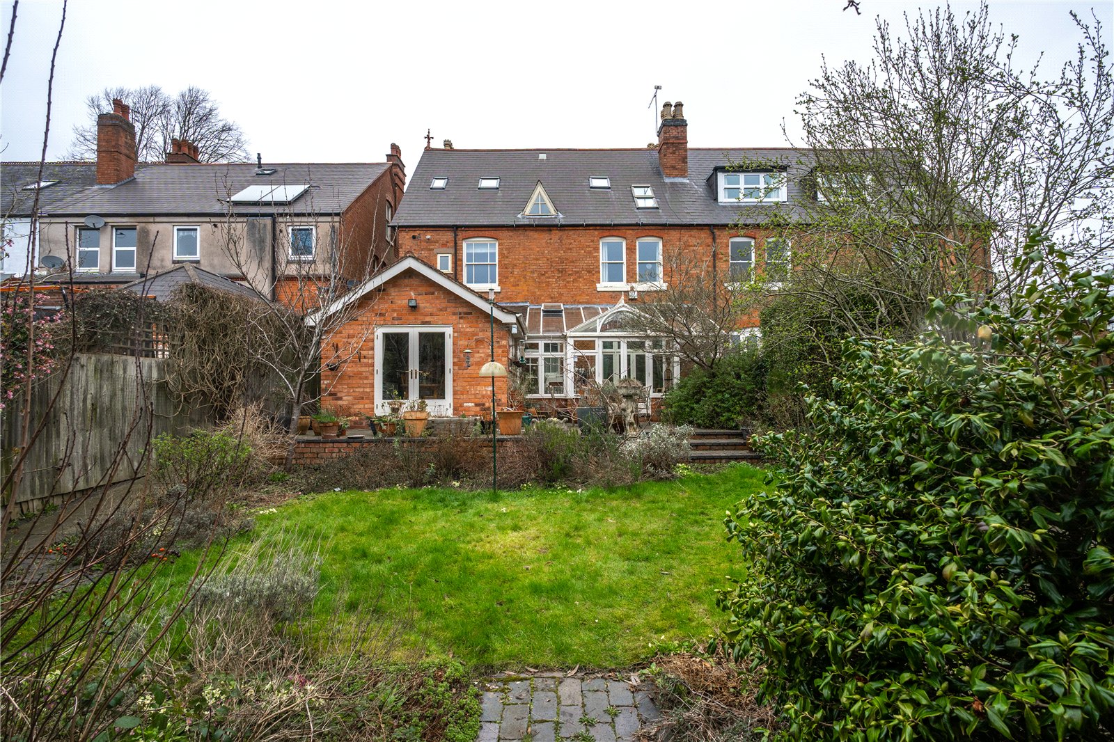 The elegant sitting room has a stripped wooden floor, deep ceiling cornicing, fitted storage and display shelving and double doors lead to the bespoke conservatory of wooden framed double glazed construction with double doors to the garden, vaulted ceiling, tiled floor and connecting door to the kitchen.