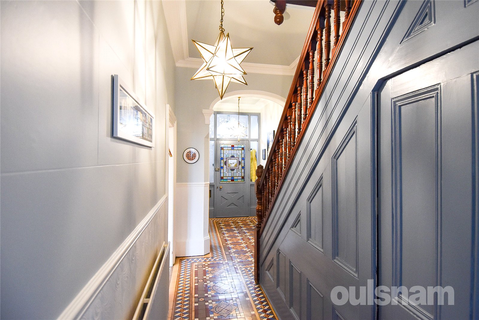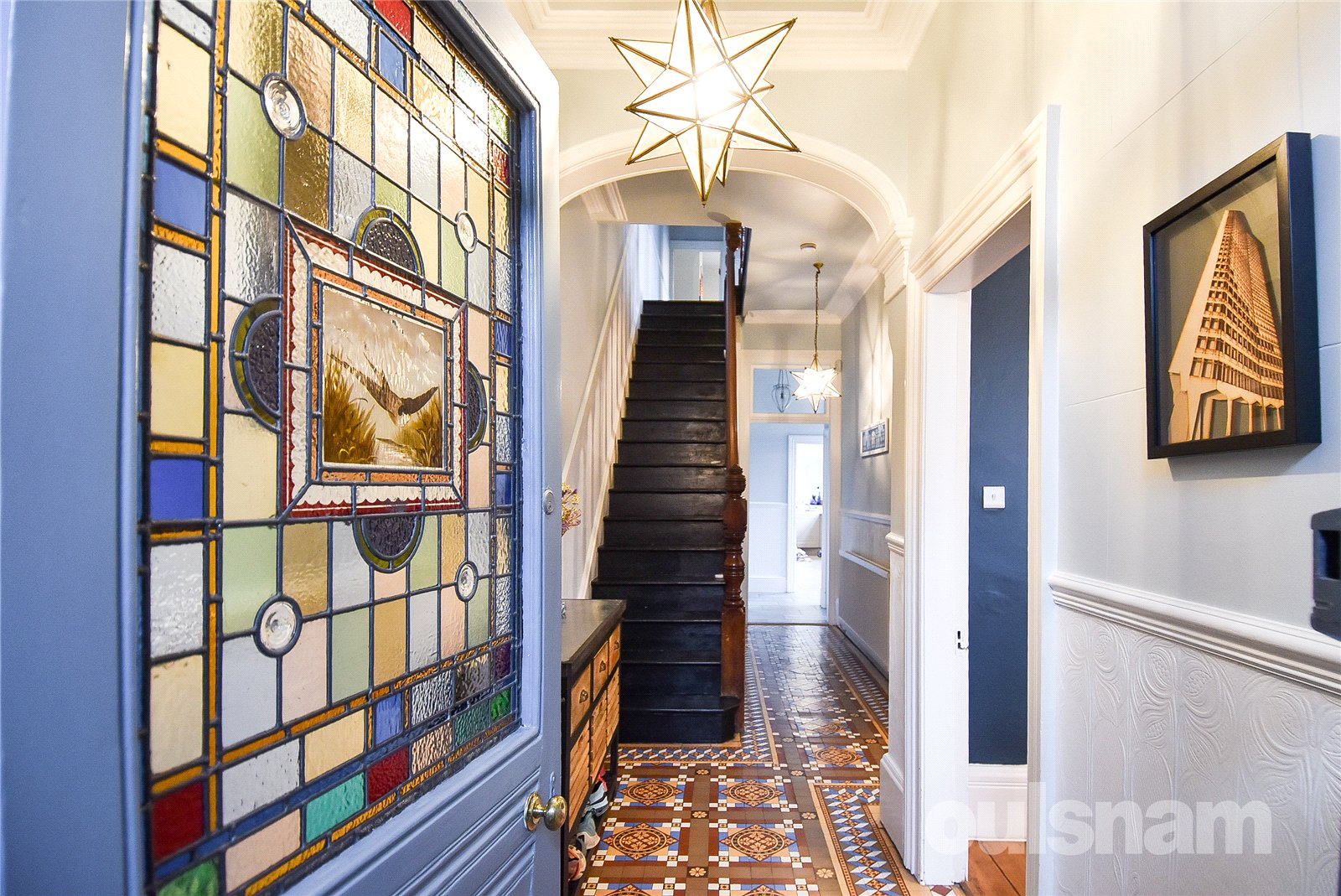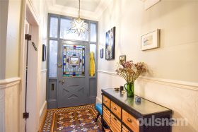 * The property is entered via an enclosed vestibule which immediately sets the tone for the character and craftsmanship found throughout the home. Beyond the vestibule, a striking entrance hallway showcases a wealth of beautifully preserved period features. The eye is instantly drawn to the exquisite Minton tiled flooring, rich in colour and intricate in design, which flows gracefully through the space. The stairs rises to the first floor with an elegantly crafted mahogany banister which forms a central focal point. High ceilings enhance the sense of space, and stained glass detailing allows natural light to filter through, adding colour and character to this impressive introduction to the home.