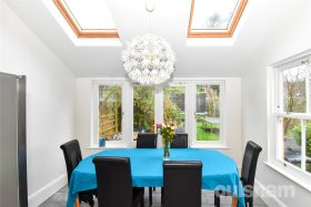* The spacious kitchen is fitted with a comprehensive range of base cupboards and wall-mounted units, providing ample storage and worktop space. Integrated appliances include a double oven, extractor fan, dishwasher, and washing machine, along with designated space for a fridge freezer, creating a practical and well-equipped cooking environment. Open plan to the kitchen is a bright dining area, enhanced by skylights that flood the space with natural light. Patio doors open directly onto the rear garden, offering an ideal setting for family dining and effortless indoor-outdoor living.