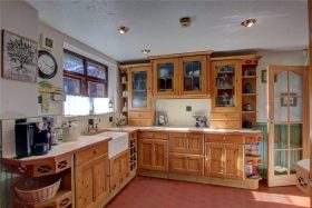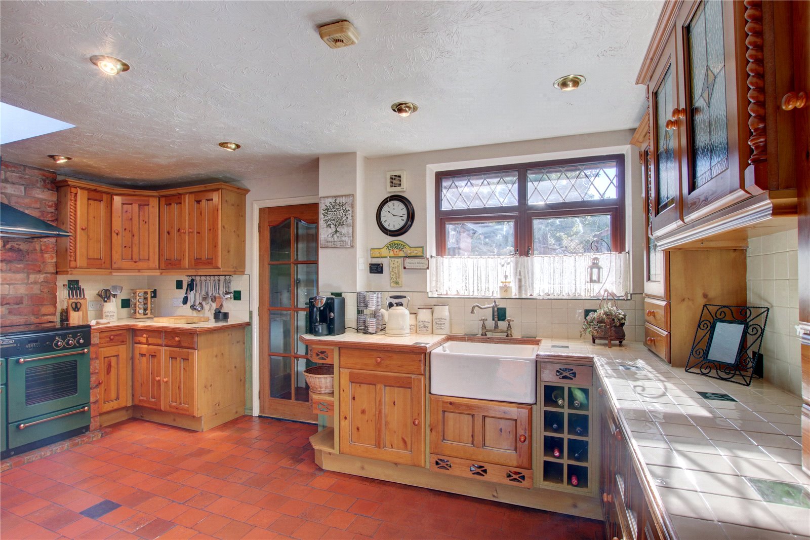 The fitted kitchen has natural wooden wall and base units, with contrasting light coloured worktops. Rangemaster cooker, tiled floor and ceiling spotlights. The kitchen leads to an adjacent shower room and utility room.