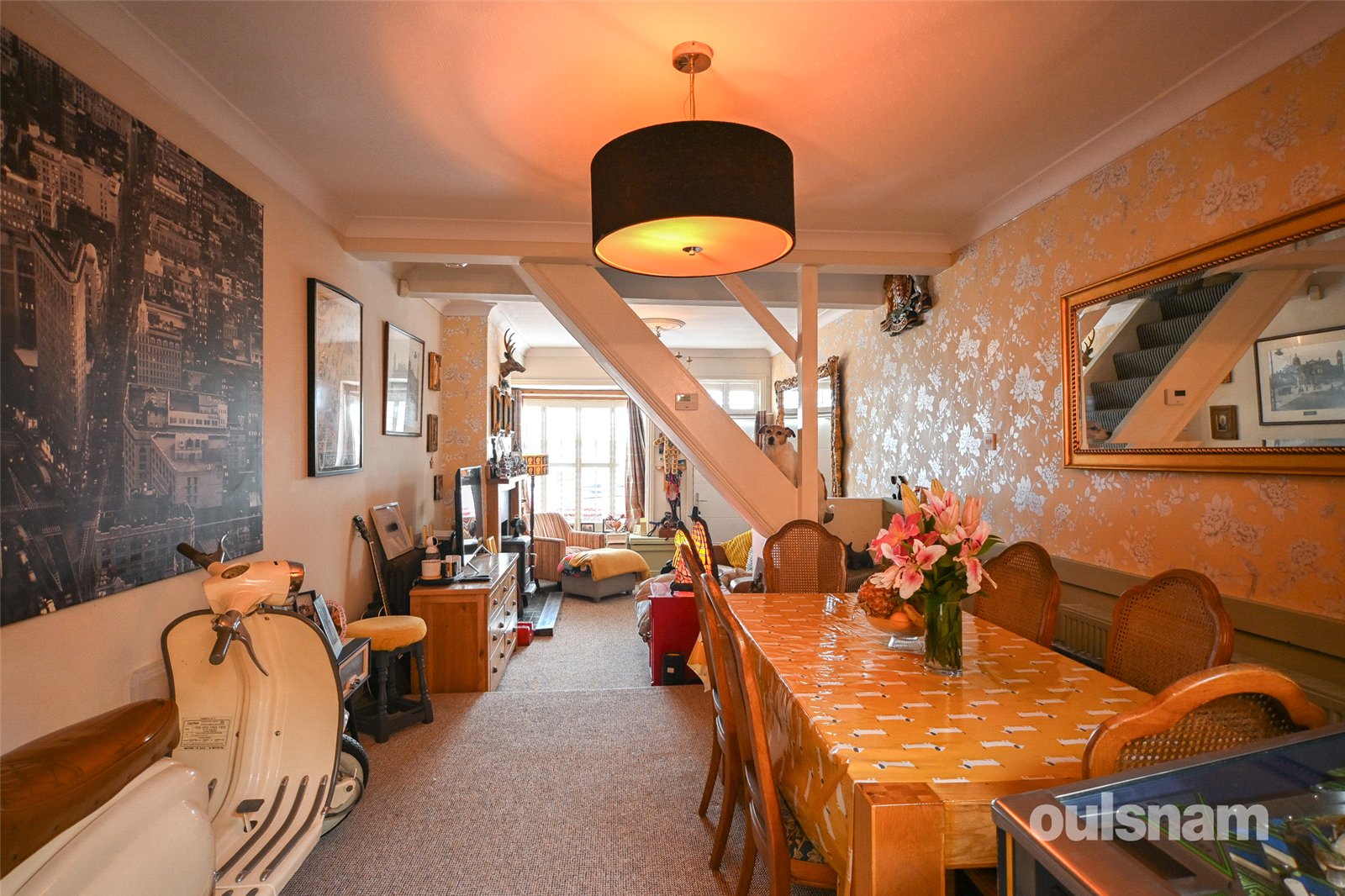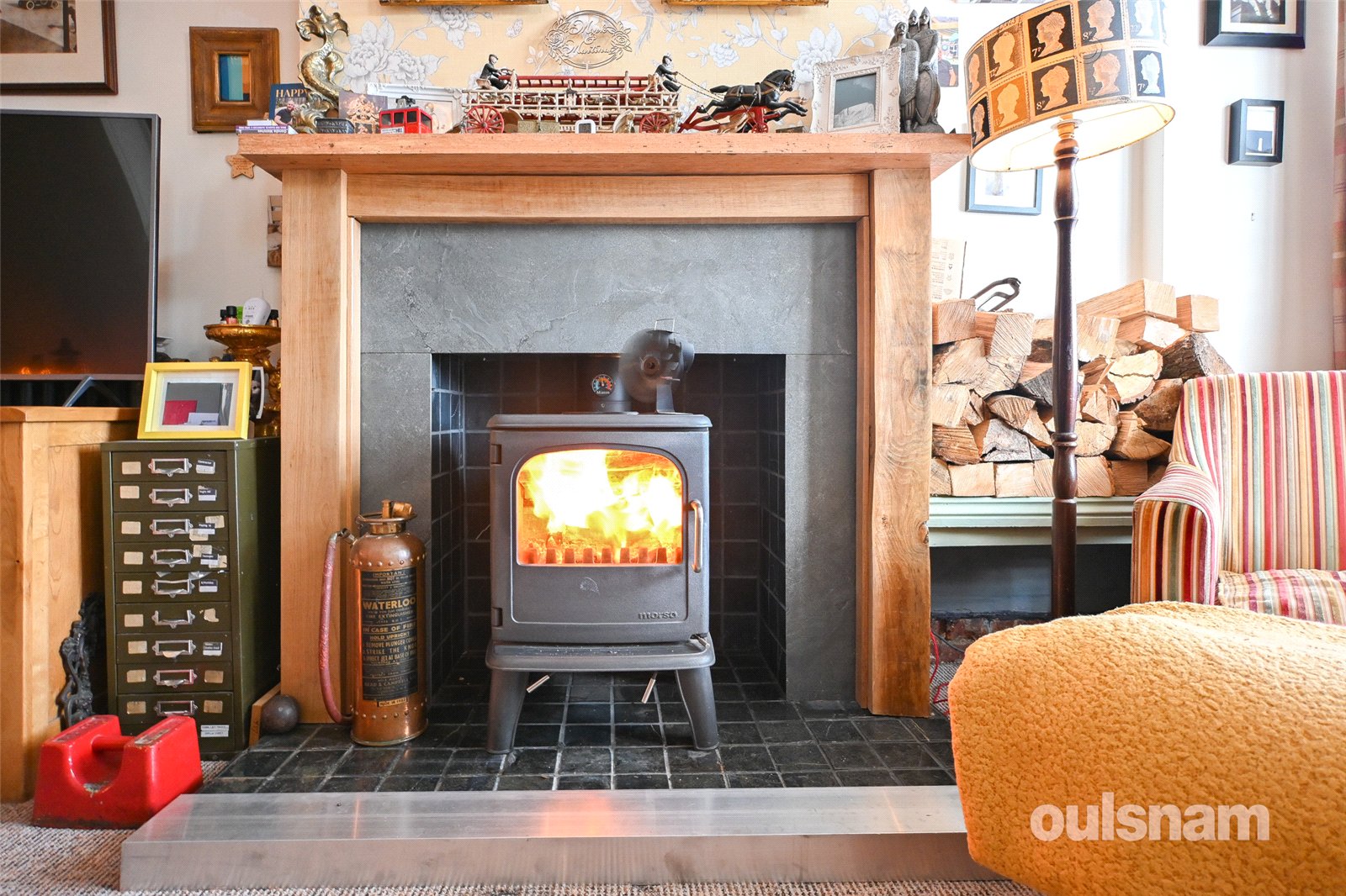 * Lounge with shutter blinds and log burner