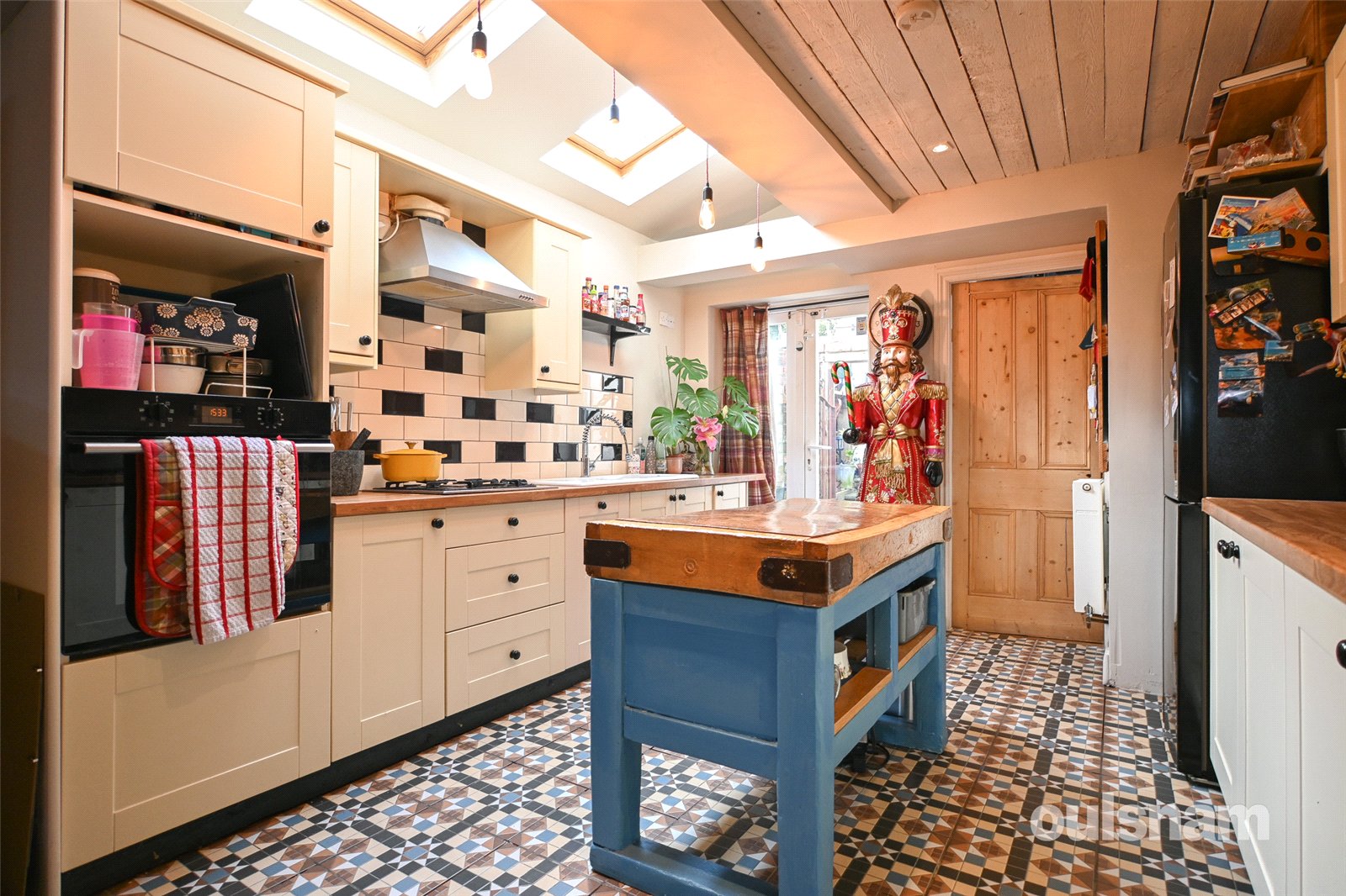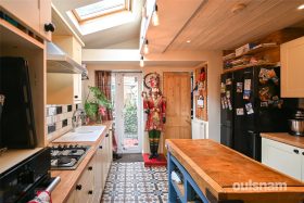 * Kitchen area with built in hob, electric oven, Belfast sink, dishwasher, two Velux windows, door to Utility room/W/C and patio door opening out to the garden