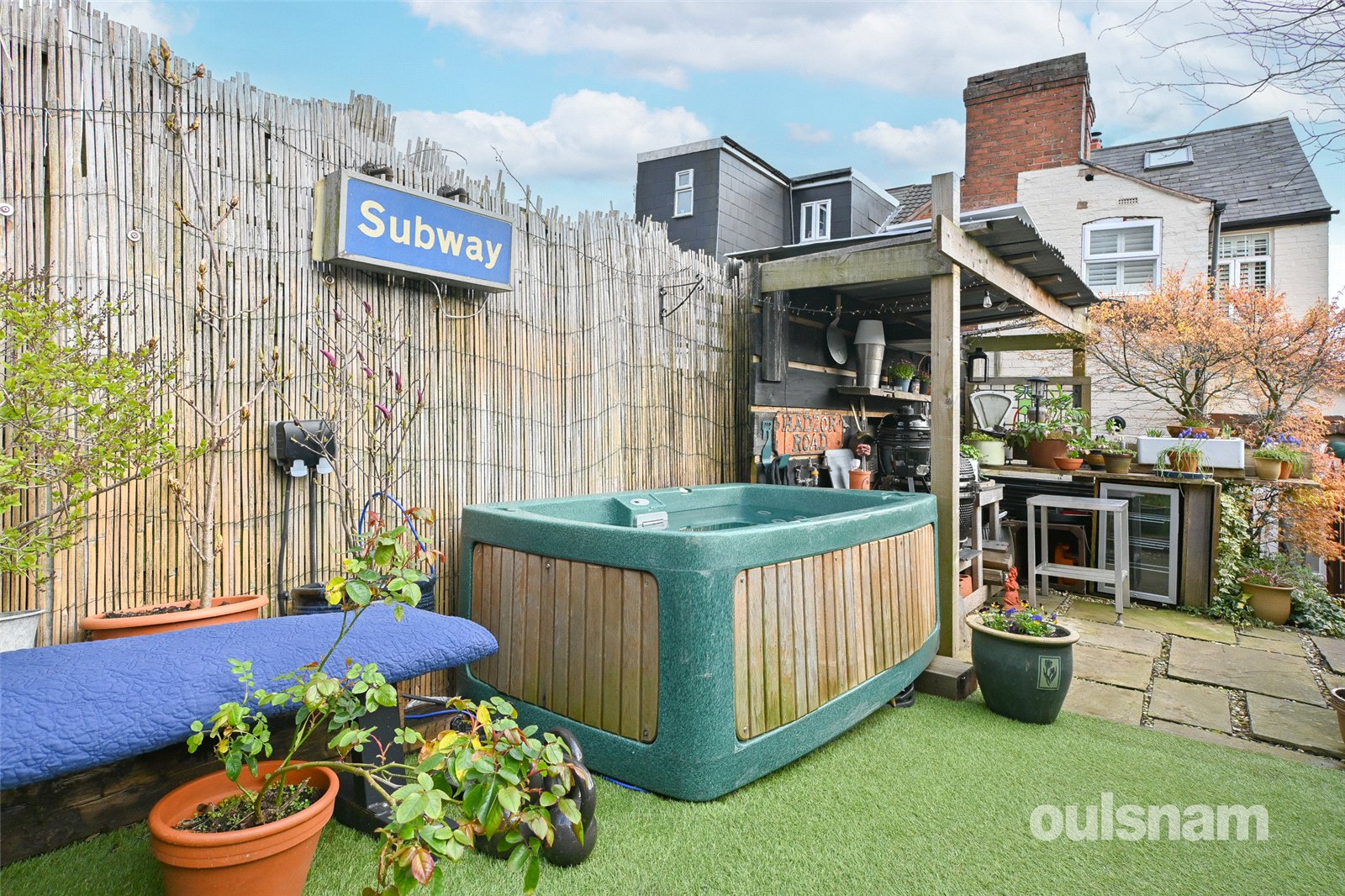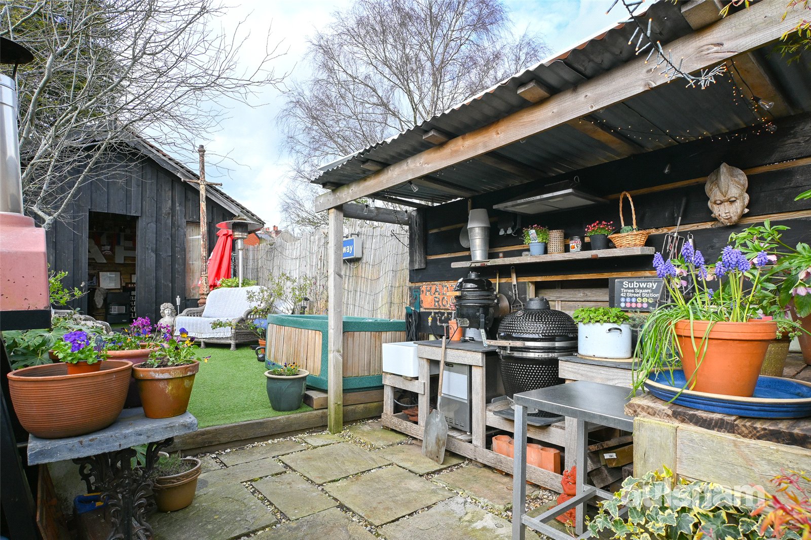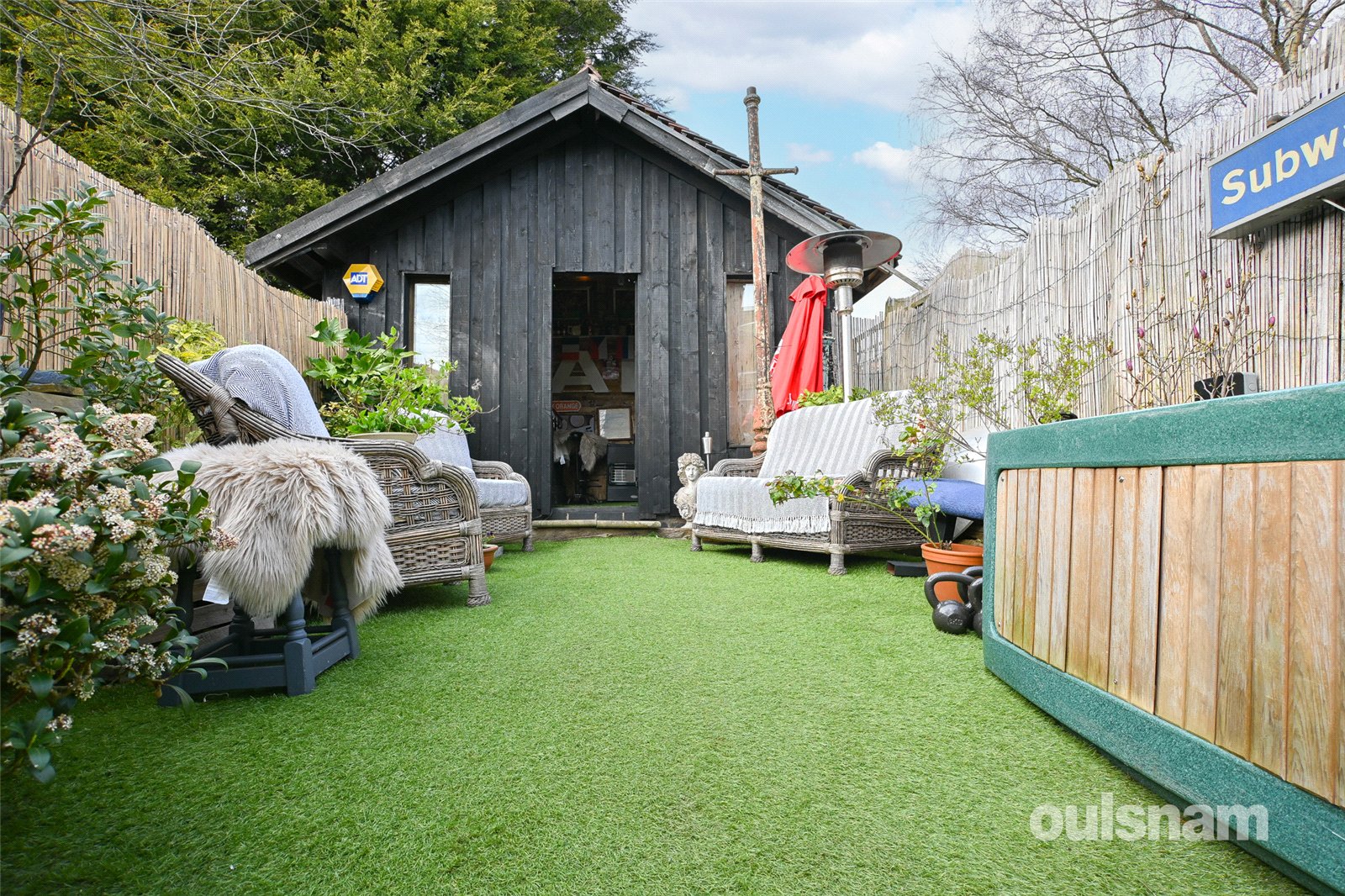 * Garden with patio area, artificial grass, hot tub, side gate access, outbuilding to the rear