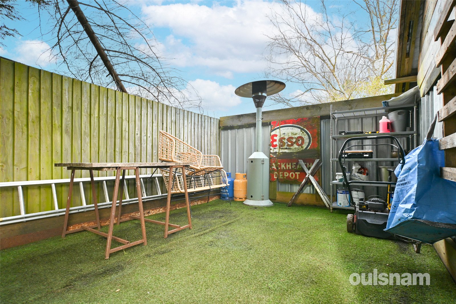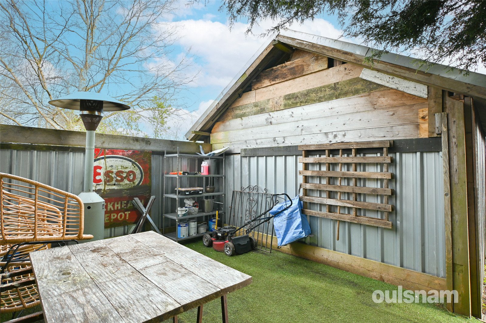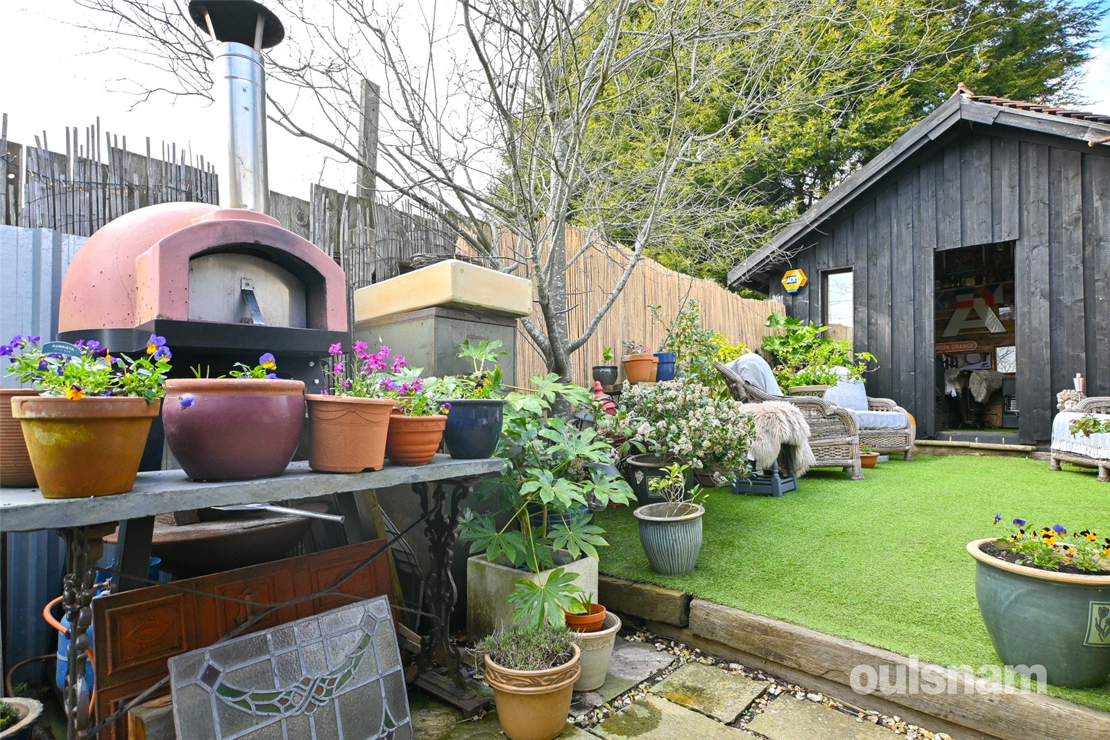 * Garden with patio area, artificial grass, hot tub, side gate access, outbuilding to the rear