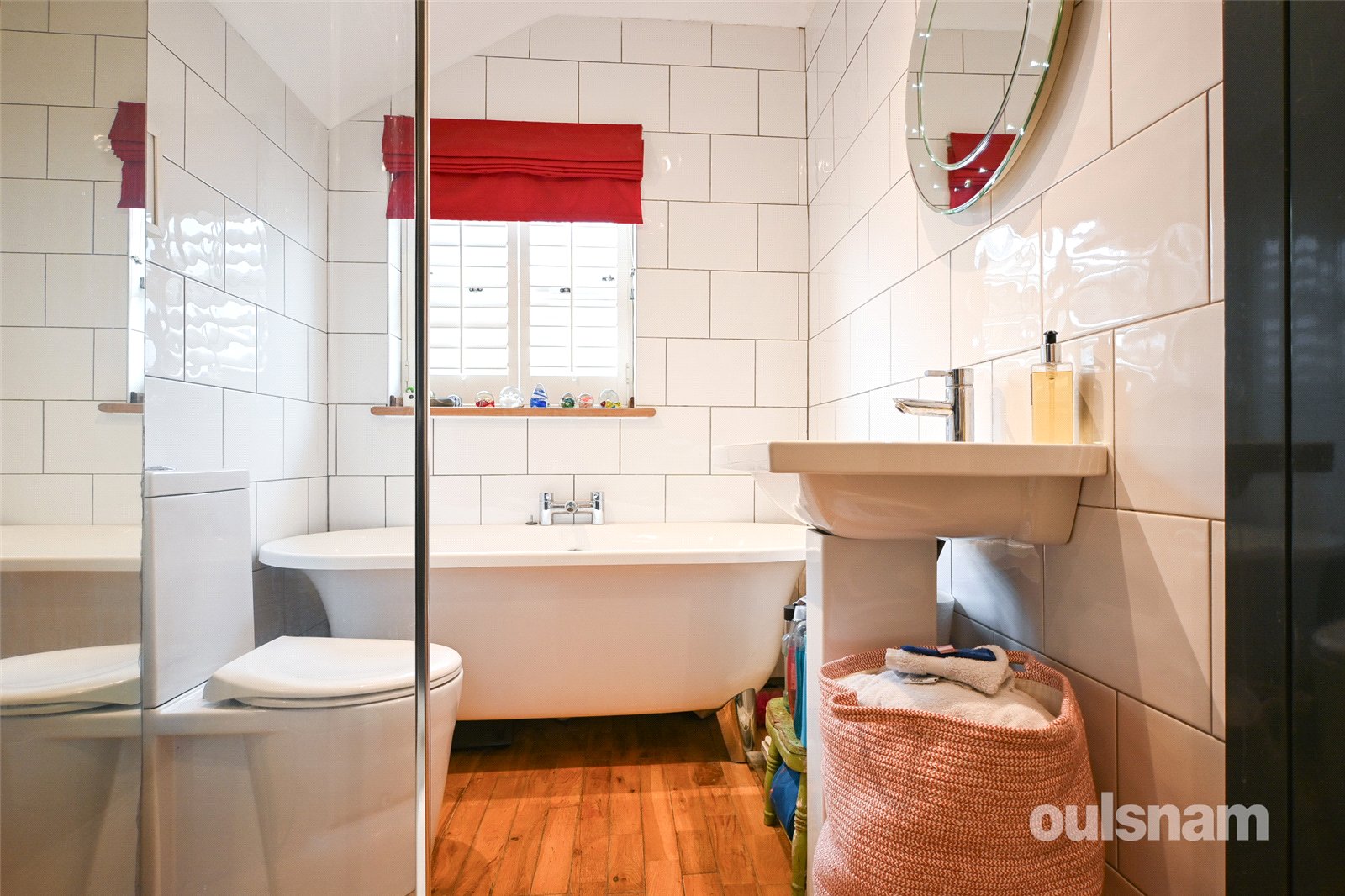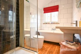 * Upstairs bathroom with freestanding bath, shower cubicle, wall mounted radiator, wash/hand basin and W/C