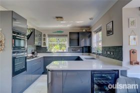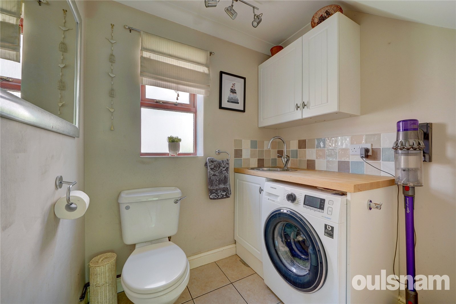 A utility room has space for a washing machine in addition to access to a storage cupboard under the stairs and W/C, sink and wall mounted storage cupboards.
