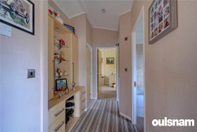 * Entrance hall with fitted wall units and shelves, doors lead into the lounge, utility room, both bedrooms and bathroom