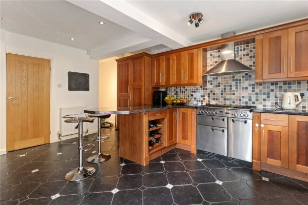* The property boasts a stylish breakfast kitchen fitted with a range of base cupboards and a wall-mounted units, providing practical storage solutions. A convenient breakfast bar offers casual dining space, while integrated appliances include hob with extractor fan, oven, and a stainless steel sink with mixer tap and drainer—perfectly combining functionality with modern living.
