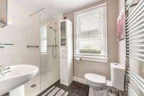 -Modern fitted shower room with standing shower cubicle, and heated towel rail.