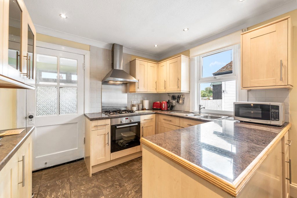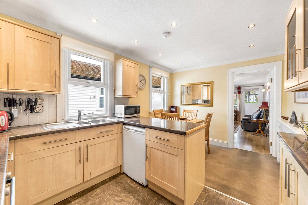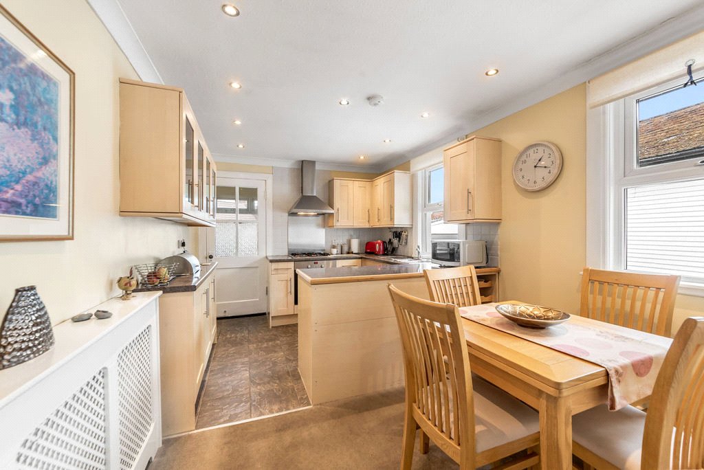 -Open plan kitchen diner, benefitting from wall and base units, with door to utility room.