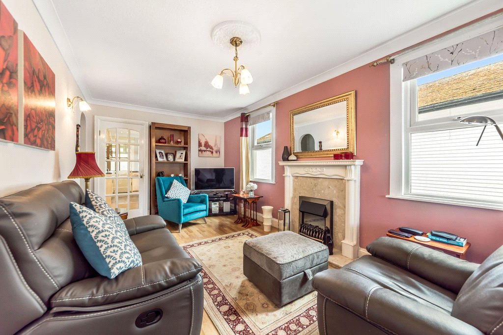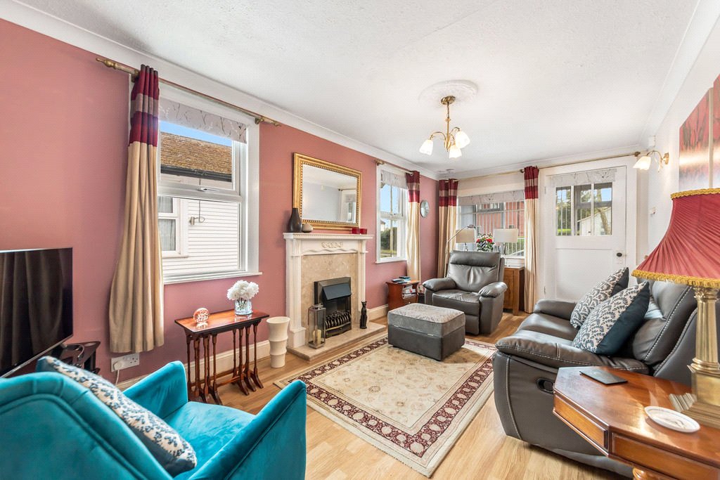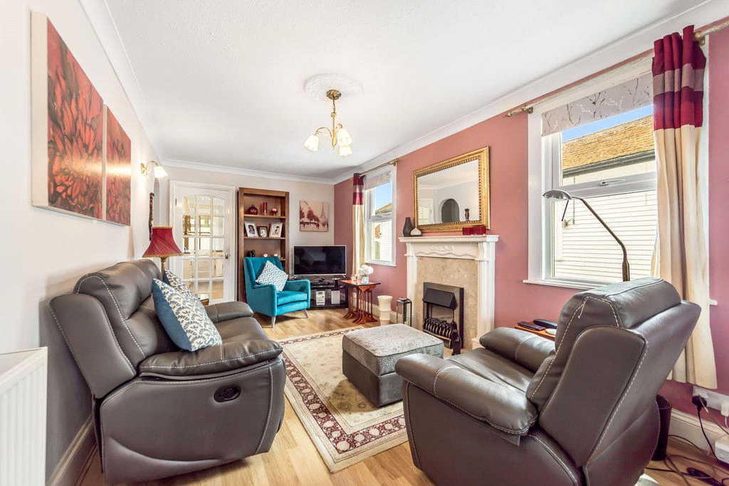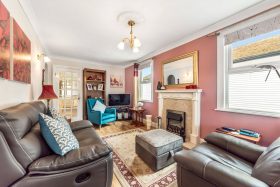 -Sizeable lounge with dual aspect windows to front and side, benefitting from a feature electric fireplace, and hardwood effect flooring.